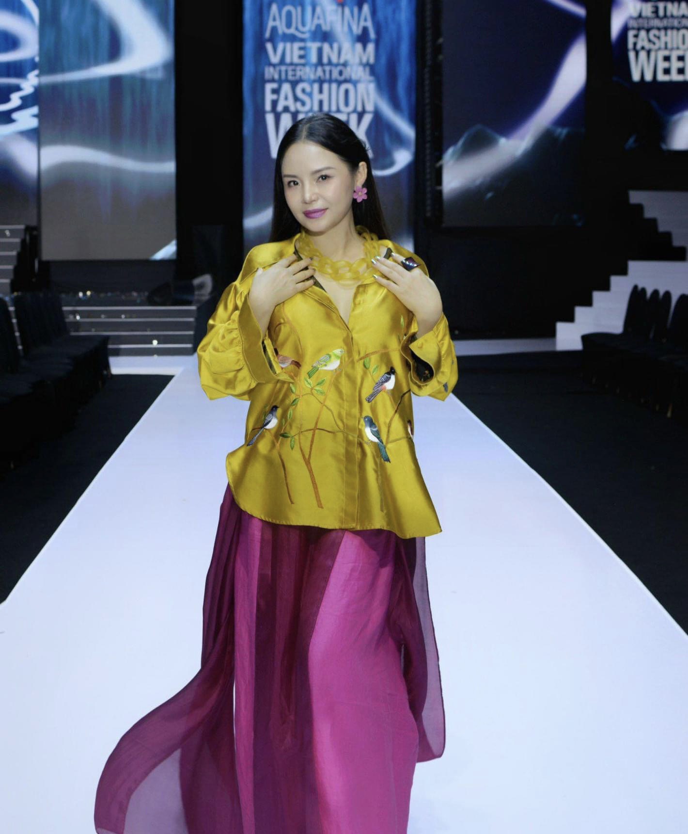 NTK Vũ Lan Anh cùng mẫu áo sơ mi lụa tại Aquafina Vietnam International Fashion Week. |