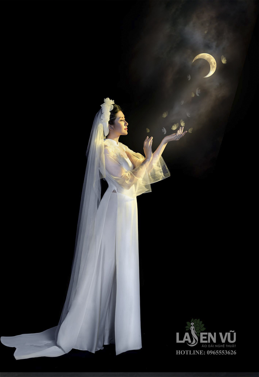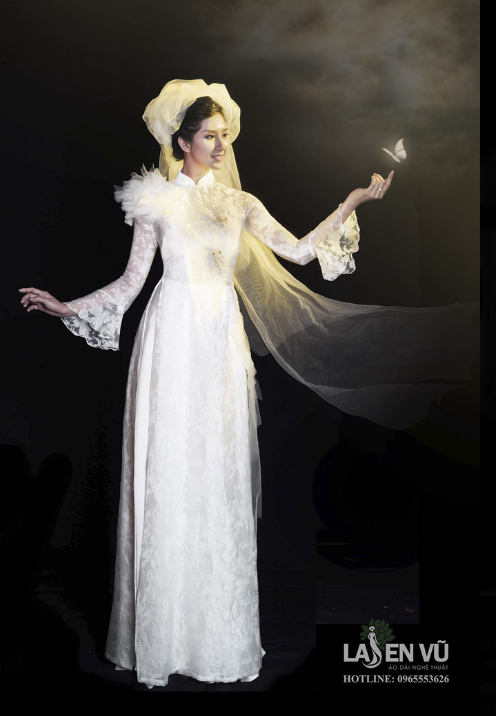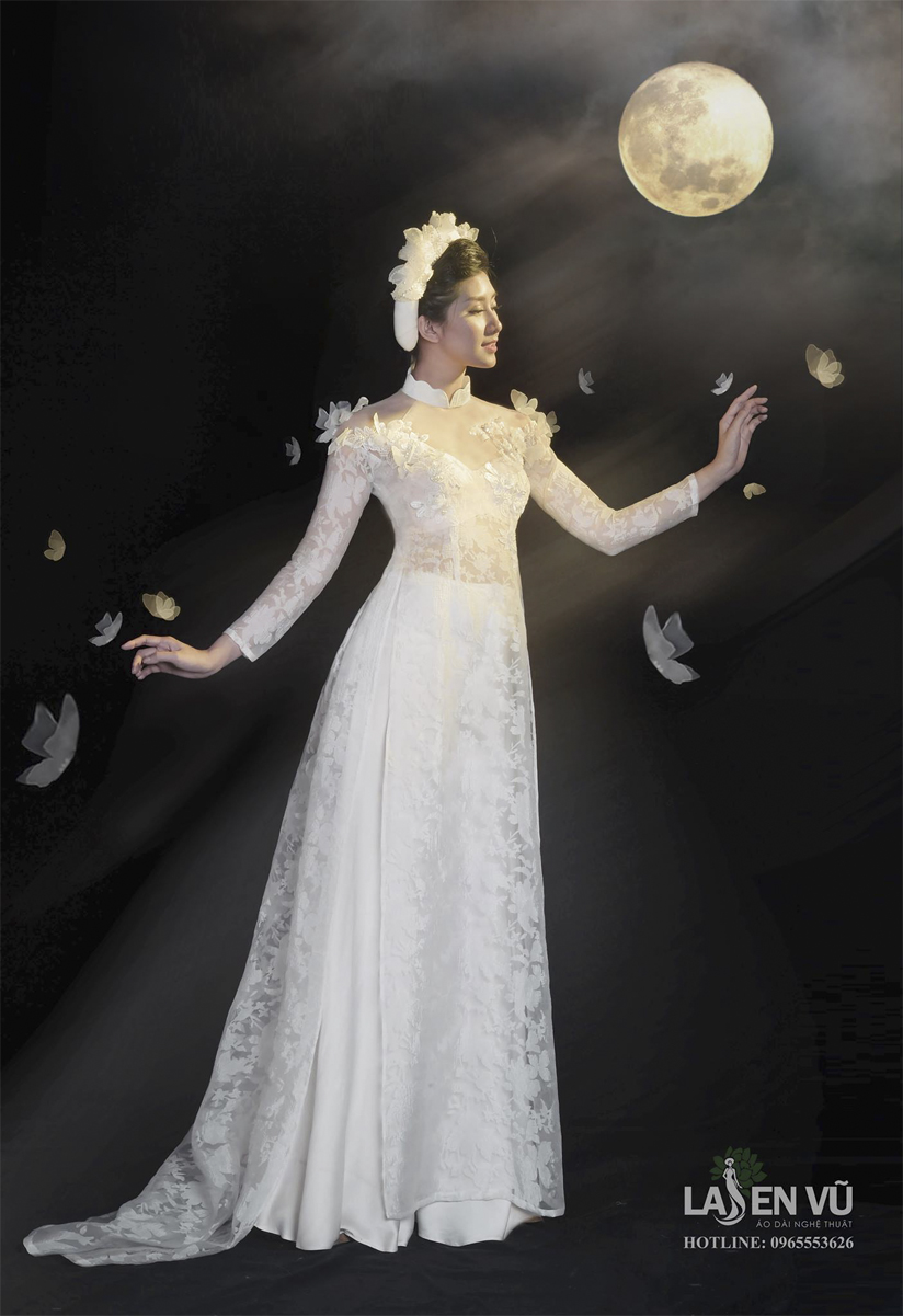 Với chất liệu ren trắng xuyên thấu, kết hợp với một lớp lụa mềm mại bên trong, chiếc áo dài phô ra những đường cong, những đường nét gợi cảm trên cơ thể của người phụ nữ. Những khoảng hở vừa đủ, vừa quyến rũ nhưng lại không bị phản cảm. Điểm xuyết trên bờ vai là những con bướm trắng nhẹ nhàng thả cánh.