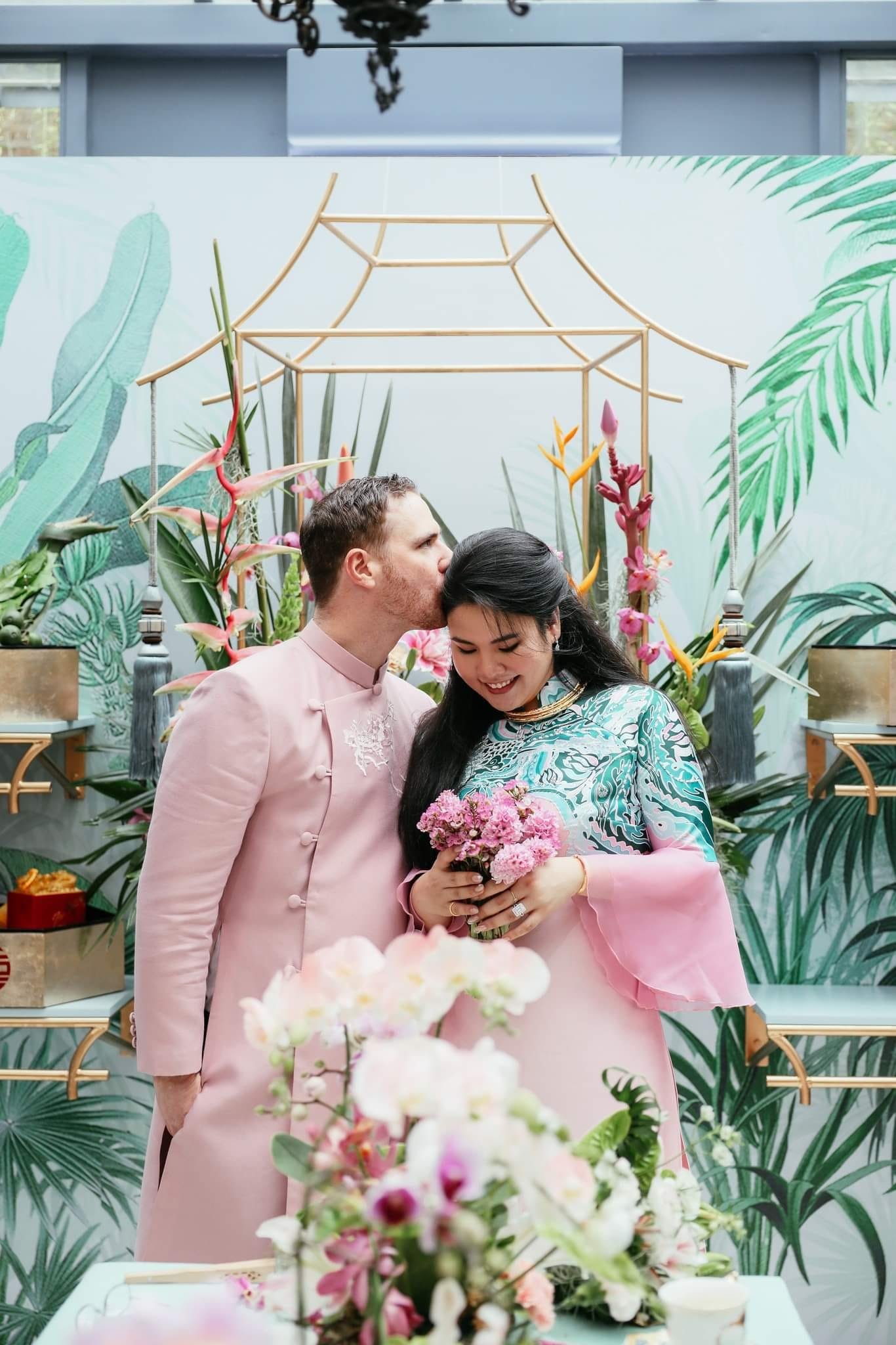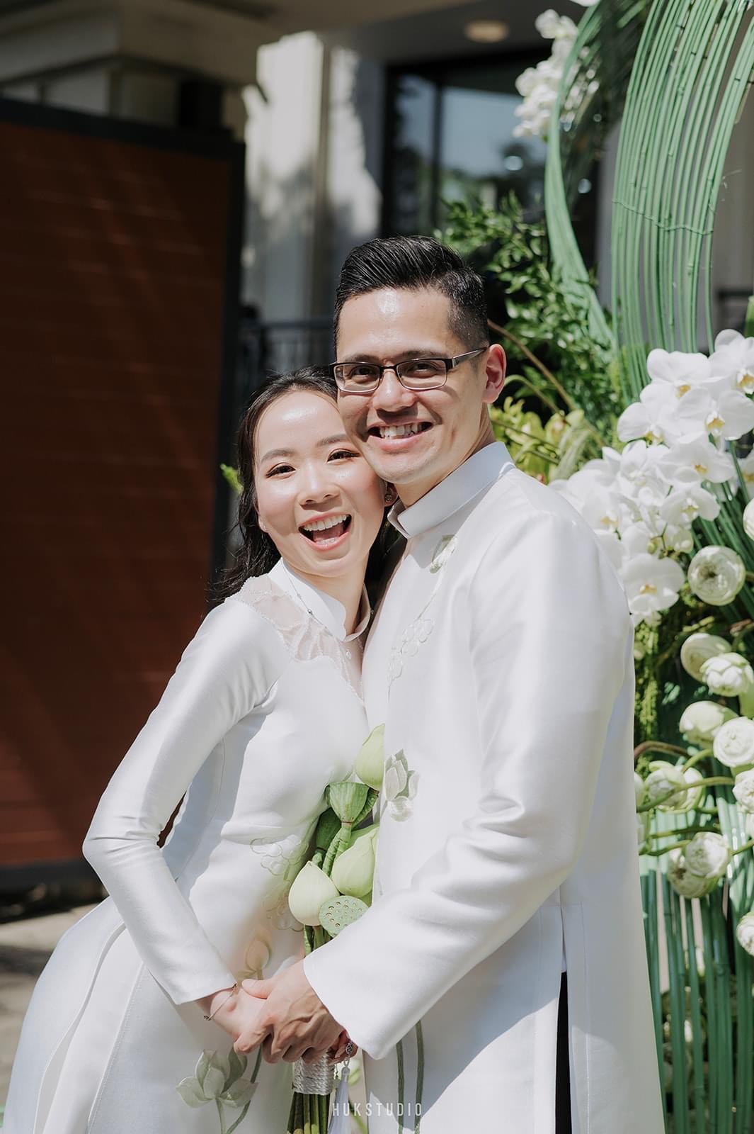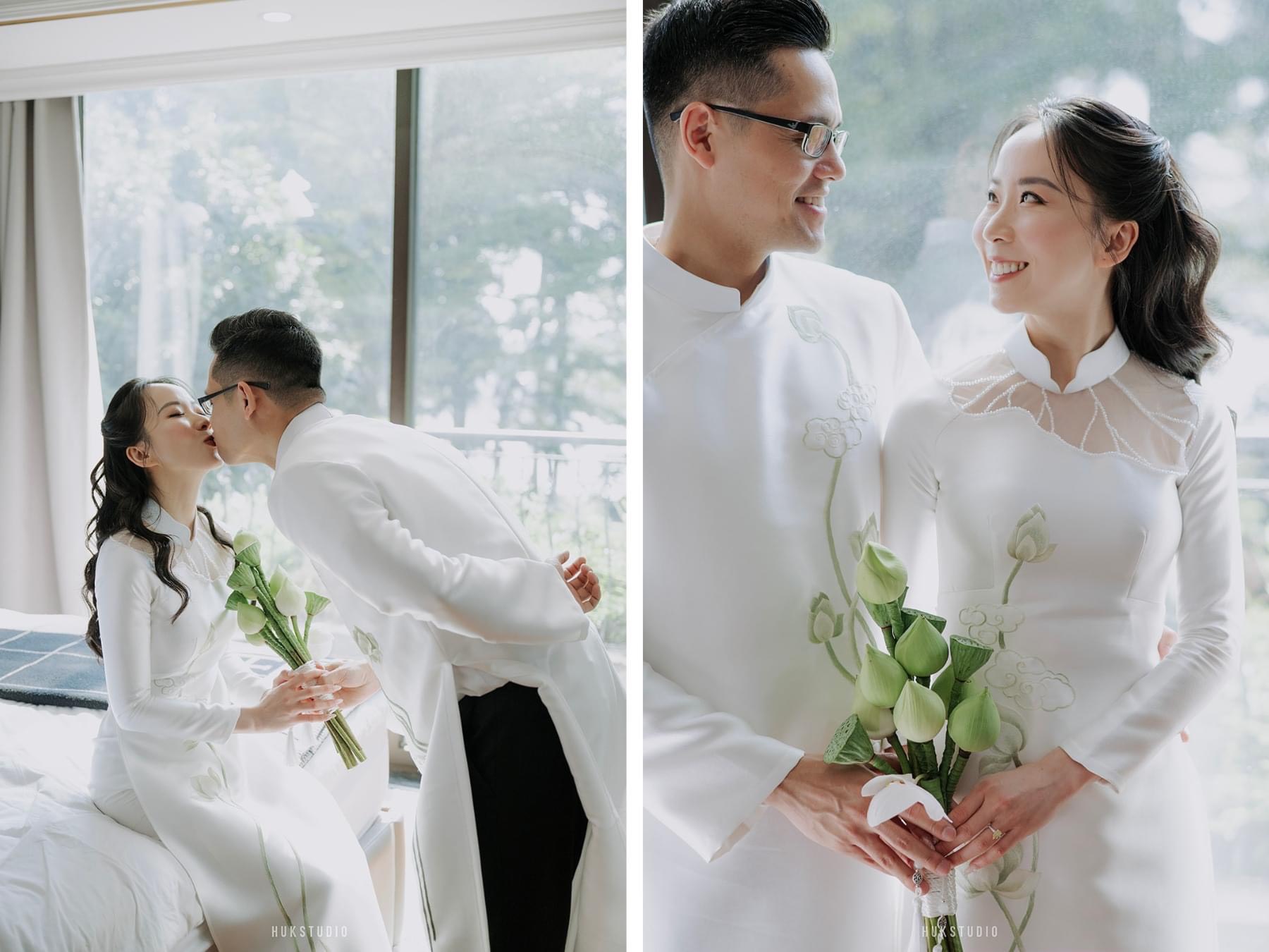 | Cô dâu Quế Khanh và chú rể Andy trong thiết kế áo dài lấy cảm hứng từ hoa sen |