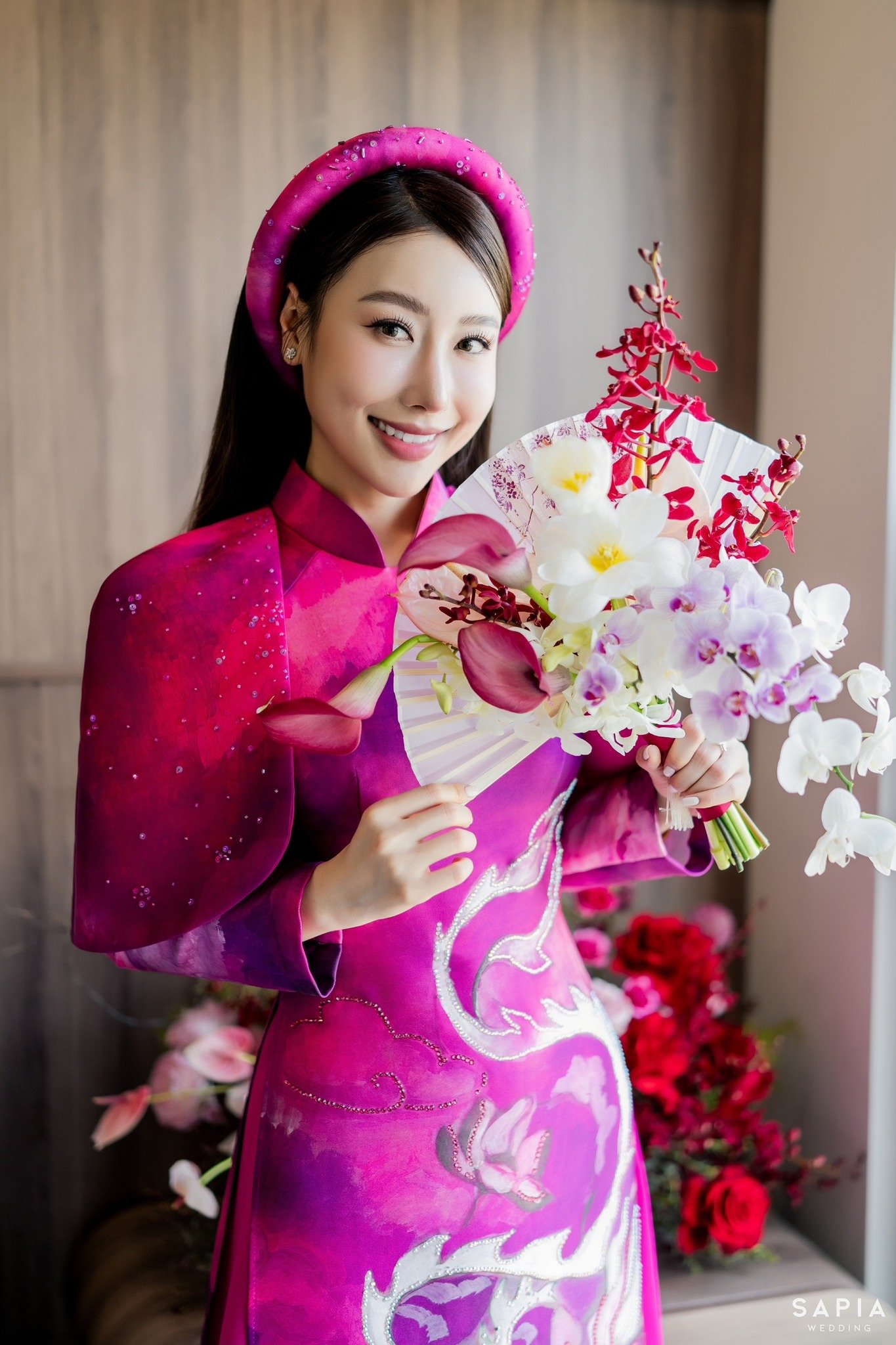Thay vì những gam màu truyền thống, Hồng Anh táo bạo lựa chọn mẫu áo dài cưới độc đáo, mang đậm dấu ấn nghệ thuật phá cách. Thiết kế này là sự kết hợp hoàn hảo giữa gam màu hồng tím rực rỡ, họa tiết rồng cách điệu được bằng những nét vẽ tỉ mỉ mang đến sự sang trọng và quý phái cho tà áo dài.