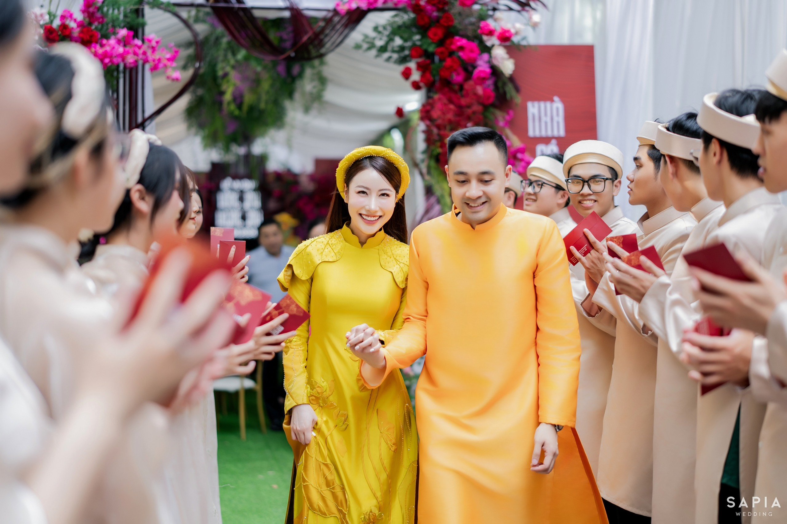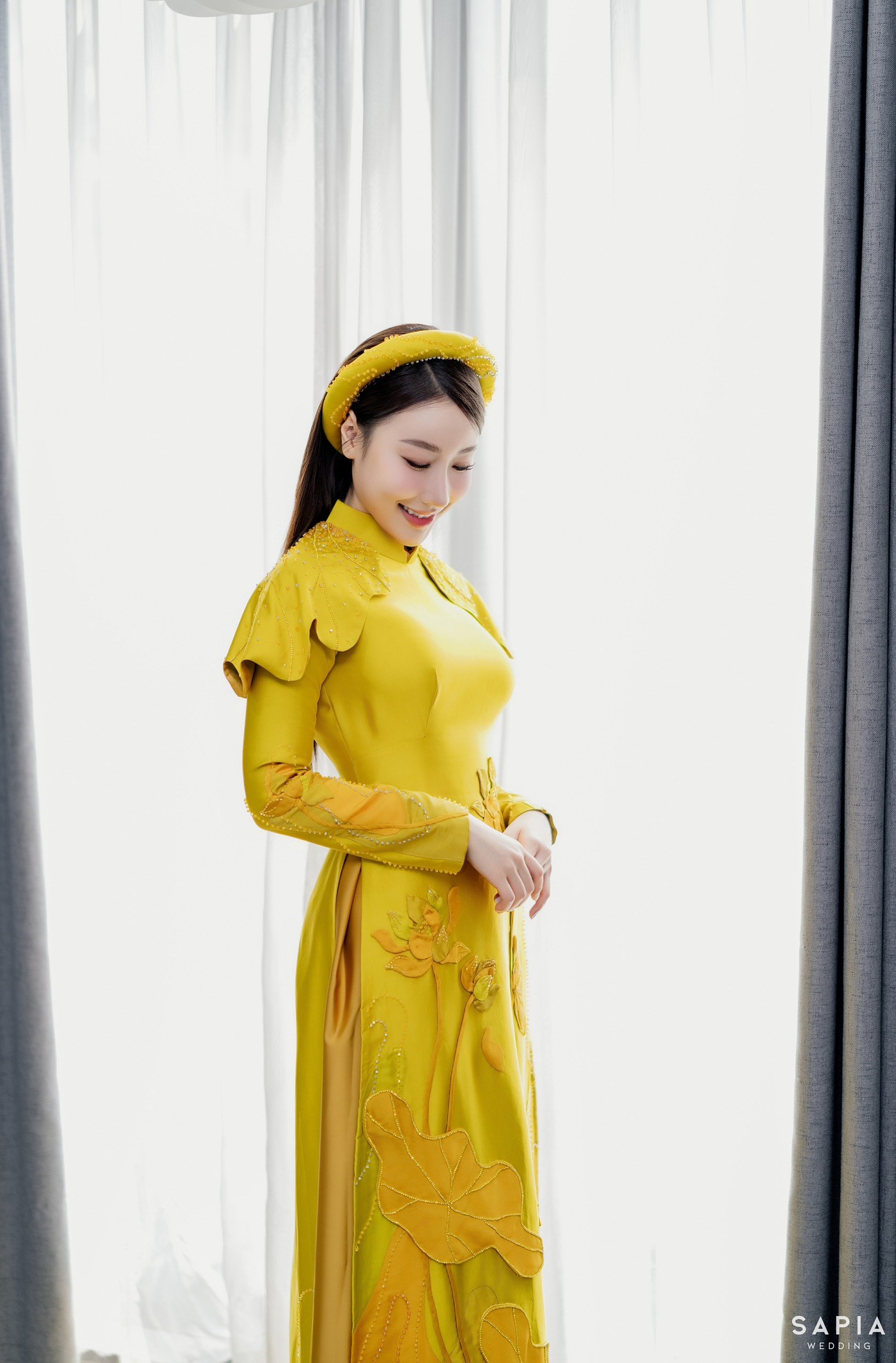 Bên cạnh đó, cô dâu Hồng Anh và chú rể Hoàng Anh còn lựa chọn thêm cho mình một bộ áo dài đôi với tone màu vàng rực rỡ, tượng trưng cho niềm vui và hạnh phúc viên mãn. Chất liệu lụa tơ tằm cao cấp mang đến sự sang trọng, quý phái mà vẫn trẻ trung cho cặp đôi. Họa tiết hoa sen được thiết kế thủ công tỉ mỉ tạo nên nét duyên ấn tượng. Chiếc áo choàng được cách điệu như chiếc lá sen, ôm ấp nhẹ nhàng đôi bờ vai, tôn lên vẻ đẹp kiều diễm của cô dâu. Tựa như đóa sen e ấp, Hồng Anh tỏa sáng rạng ngời, tỏa ra những nét yêu kiều, hấp dẫn nhất trong ngày trọng đại của mình.