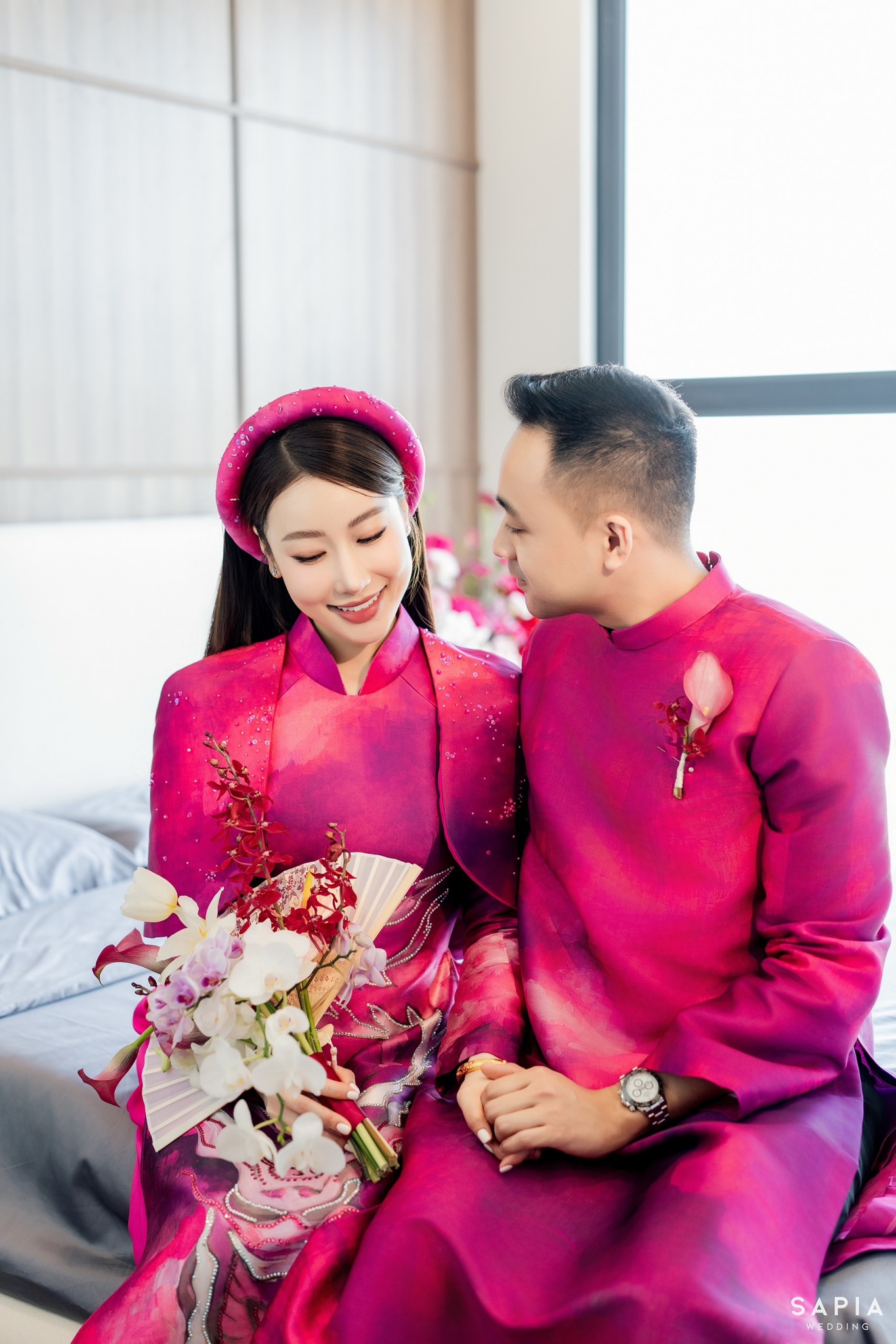 | Nét đẹp rạng ngời của cô dâu Hồng Anh và chú rể Hoàng Anh khi diện áo dài cưới đôi của LA Sen Vũ |